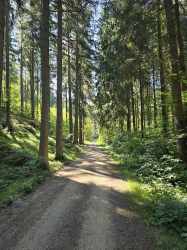 Die Abfahrt nach Hagenberg war dann der Lohn für die Mühen, eine wunderbare, atemberaubende Aussicht begleitete uns und der Duft von Heu lag in der Luft, eine duftende Liebeserklärung an den Sommer. Wir glitten hinab, bis wir den Weg zum Kalvarienberg in Wartberg nahmen. Sepp hatte es heute eilig und suchte den kürzesten Heimweg, während wir den Weg zur Kriehmühle nahmen, der uns durch kleine Wälder und über holprige Pfade führte.