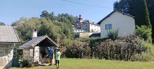 Mächtig zog es uns weiter bergauf zur Schloss-Taverne, wo Fredi W hier alles gab und mit flottem Tritt vorausrollte. Nach einem herrlichen Mittagessen brachen wir wieder auf in Richtung Wittinghof. Über eine schmale Brücke und einen Wanderweg gelangten wir auf den Güterweg, der uns hinauf nach Dingdorf führte. Unser Pressefotograf hatte plötzlich einen außerordentlichen Eifer, er rauschte am ausgewaschenen Weg mit unwiderstehlichem Elan davon. Franz bezwang die Steigung mühelos, und ich versuchte im ruhigen Wiegetritt, den Anschluss nicht zu verpassen.
