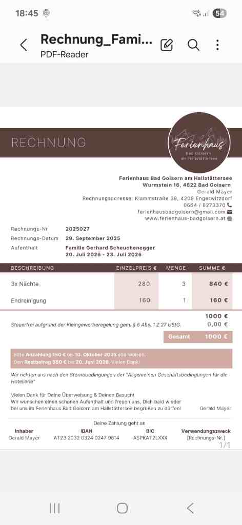 Fürs Quartier habe ich bereits 150€ angezahlt. Der Rest von 970€ sind bis 20 Juni zu bezahlen.