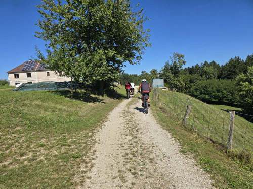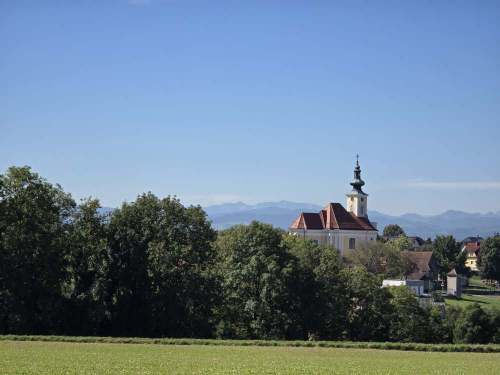 Die Abfahrt nach Rosenau genießen wir nach dem mühevollen, schweißtreibenden Anstieg. Der Weg entlang der Bahn führt uns zurück nach Kematen, von dort weiter nach Mauer. Wir radeln an einer Allee Obstbäumen entlang , prall voll mit Äpfeln und Birnen und der Duft reifen Obstes steigt uns in die Nasen. Der Weg unserer Tour zieht gelegentlich nach oben, doch immer wieder belohnt uns eine wunderbaren Abfahrt. Mächtige Traktoren tauchen auf, ziehen vorbei und Gänse auf der Weide starren uns schnatternd nach.