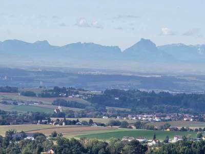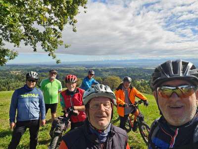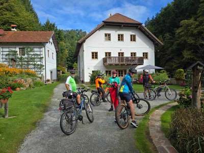 Wir erreichen die Kumpf-Mühle, verabschieden uns behutsam von der Feldaist und treten den Anstieg nach Pregartsdorf an. Ernst zieht die Steigung mühelos hinauf, seine Pedale scheinen unter ihm zu singen und sein Atem bleibt leise und kontrolliert. Die Steigung fordert unser aller Atem und Beine, doch oben öffnet sich der Blick, Reizvoll liegt das Land vor uns, eine Landschaft aus Hügeln, Wäldern und weitläufigen Feldern. Wir lassen unsere Räder nun hinunter rollen nach Reichenstein. Die alte Ruine schmiegt sich hoch über den Ort an die Felsen. Die Waldaist gleitet aus Liebenau heraus und beginnt ihre majestätische Reise durch üppige Uferlandschaften. Es war voriges Jahr überwältigend zu beobachten, wie weiße und schwarze Aist sich in Weitersfelden vereinen, anschließend durch idyllische Täler zieht, in denen man Ruhe und Staunen zugleich erfährt. Nun fließt die Waldaist an uns vorbei, das Plätschern des Wassers mischt sich mit dem leisen Rascheln der Blätter und der Wind trägt Gerüche von feuchtem Moos und wilden Kräutern heran, während wir auf einer verkehrsarmen Straße die Pfahlmühle erreichen. Sepp ist wie ein Vulkan aus Kraft, er nimmt die Anstiege mit enormer Geschwindigkeit und auch hier auf der Geraden ist er nicht zu schlagen, wir müssen uns zusammenreißen, um ihn nicht aus dem Blick zu verlieren. Die Luft wird nun wärmer, der Blick weiter, und der Weg führt sanft nach Stranzberg, dann in Serpentinen hinauf am Haarlandberg. Johann tretet wie ein Uhrwerk die Steigung hinauf, sein Tretfluss gleicht einem fein abgestimmten Mechanismus, der uns alle antreibt. Oben offenbart sich eine grandiose Aussicht aufs Voralpenland, ein Panorama, das sich in unser Gedächtnis brennt.