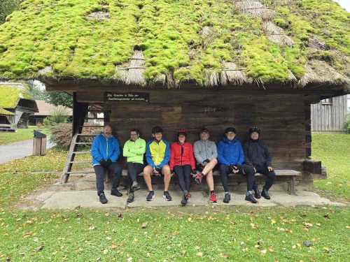 Wir brachen um halb 10 Uhr bei ziemlich wolkenbehangenen Himmel auf, doch ab und zu öffnete sich auch ein kleines Sonnenfenster, das die Landschaft in goldene Farben tauchte und uns einen flüchtigen Augenblick von Wärme schenkte. Wir waren heute acht Freunde, fest entschlossen, den herbstlichen Temperaturen zu trotzen und uns auf zwei Rädern über Ruhstetten aus in Richtung Freilichtmuseum Stadt Haag zu bewegen. Die ersten Kilometer führten uns sanft bergab nach Ried und Oberzirking. Sepp, mit seinem Kälte unempfindlichen Temperament, trug kurze Ärmel und kurze Hose, während die Kälte den Rest von uns umhüllte. Rundum roch es nach feuchter Erde und frischem Gras und hinter uns zischte der Wind durch die Bäume während wir bei Mauthausen über die Donau radelten.