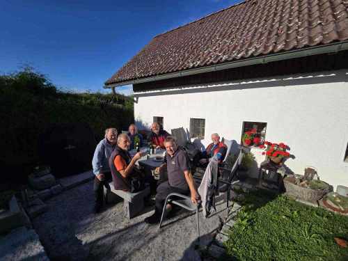 Sepp, der uns zur Donau Überfahrt einlud, -herzlichen Dank Sepp-, führte uns jetzt durch den Ort bis hinauf nach Ried, wo uns ein lieblicher Wiesenweg in den Ort hinein leitete und schließlich zum Franz, der uns heute mit Getränken verwöhnte. Maria, in atemberaubendem schwarzen Outfit, backte einen herrlich schmeckenden Kuchen, dazu selbstgemachtes Brot und feuriger Streichkäse und auch den sagenumwobenen Schwarz Franz Speck durften wir verkosten. Einfach großartig eure Gastfreundschaft, Danke Maria und Franz.