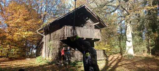 Unser erster Halt war in Katsdorf, wo uns Manfred bereits erwartete. Er ist nicht nur ein erfahrener Radler, sondern auch ein hervorragender Geschichtenerzähler, der allerlei Anekdoten aus seinem Heimatort Katsdorf wusste. Wir radeln nun weiter in Richtung Edtsdorf und biegen ein in einen traumhaften Wiesenweg, sanft geschwungene, laubbedeckte Pfade, umrahmt von der dunkler Erde der Feldern. Nach Amberg, einer kleinen Ortschaft, setzten wir unsere Fahrt auf einsamen Straßen in Richtung Hohenstein fort. Johann, heute wieder besonders motiviert, drückte ein wenig aufs Tempo und wir passierten die Jausenstation Kernegger. Der schmale Waldweg, gesäumt von hohen Bäumen, führte uns bis zu einem Zaun, der das Waldstück im Hintergrund umschloss. Hier, auf dem Laub bedeckten Weg, hielten wir an und bewunderten ein charmantes Jagdhäusl, das inmitten der Natur lag.