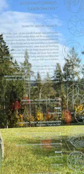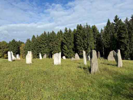 Vorbei an der Mostschänke Grüner rollen wir am steilen Güterweg hinauf in das Bauerndorf Penzendorf. Von dort oben genießen wir eine wunderbare Aussicht ins Alpenvorland, dort drüber ragt die Kirchturmspitze von Allerheiligen heraus, Wartberg liegt am Hügel vor uns und am Horizont schmiegt sich ein schmales Nebelband ans Blau des Himmels. Aus dem Nebel ragen die Berge der Alpen hervor, besonders die Haube des Traunsteins fängt unser Blick ein. Wir radeln weiter zur Akademie Zaunreiter und erreichen unser heutiges Tourziel, den Geokreispunkt- Lebensmatrix. Wir betrachten die kreisrund angebrachten Steine und die eingemeißelten Symbole.
