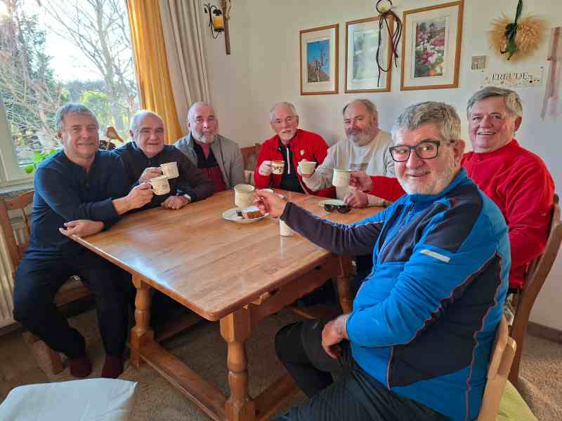Auf den Feldwegen nach Kollnerberg war die Stimmung weiterhin ausgelassen. Sepp fuhr jetzt fast immer an der Spitze und auch Max, der seit langem wieder mit uns fuhr, beiden zeigten richtig viel Elan und beeindruckten uns mit ihrer Kondition. Karl hatte zwar Bedenken wegen der Kälte geäußert, doch die wärmenden Sonnenstrahlen sorgten dafür, dass wir uns wohlfühlten. So ging es weiter über Rieder Boden nach Danndorf und Marwach. Franz schwärmt derart von den selbstgemachten Weihnachtskekse, daß wir seine Einladung dankbar annahmen.