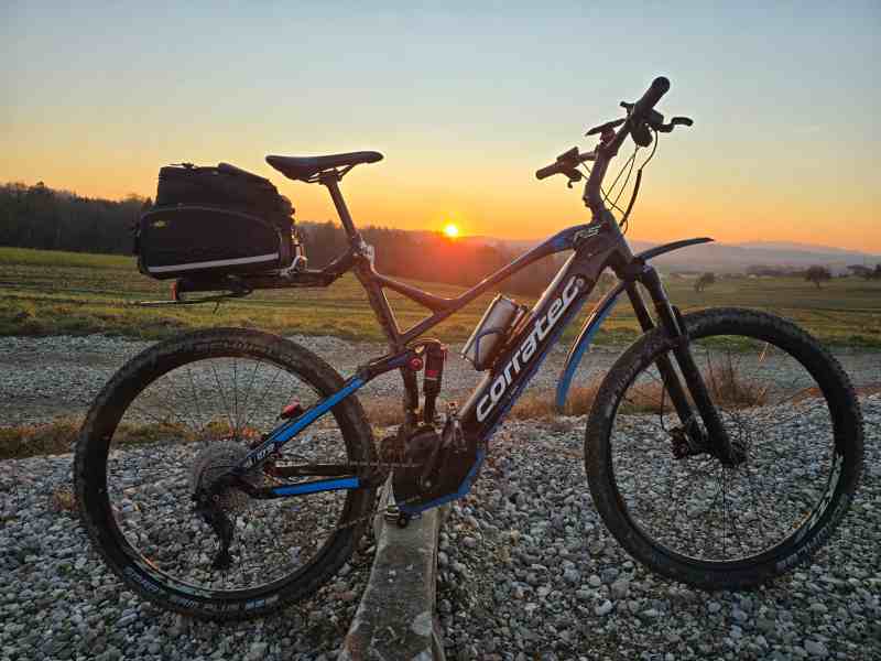 Wir lassen das mittlerweile vertraute kleine Dorf Marwach hinter uns und radeln dem sanft plätschernden Riederbach entlang. Der Weg ist gesäumt von braunem Laub, das im sanften Licht der Abendsonne glitzert. Die Temperatur liegt bei kühlen 2 Grad und man spürt die Kälte der winterlichen Luft im Gesicht. Die Sonne beginnt sich hinter den sanften Hügeln zu verstecken und wir wissen, dass die Dämmerung bald hereinbrechen wird. Mit jedem Tritt in die Pedale spüren wir die Anstrengung des Anstiegs nach Wachsreith. Der Feldweg, der bereits wieder gefroren ist, verlangt uns einiges ab. Doch die Mühe lohnt sich, denn die Abendsonne, eine leuchtende gelbe Kugel am Himmel, sendet ihre letzten Strahlen durch die Baumkronen. Die Silhouetten der Waldbäume erscheinen in majestätischer Schönheit im nun so mystischen Licht. Johann, unser bester Fotograf überhaupt, tritt kräftig in die Pedale. Er klettert den Anstieg hinauf, als wäre er eine Gemse, flink und voller Energie. Sein Lächeln spricht Bände, er ist ganz in seinem Element, umgeben von der Schönheit der Natur.