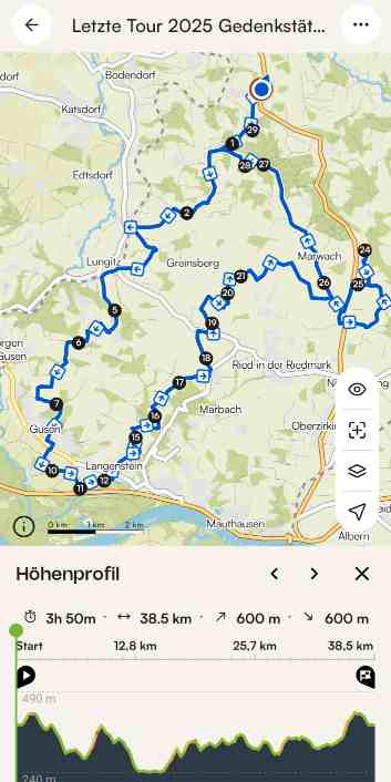Auf schmalen Feldwegen radelten wir weiter nach Frankenberg. Die Aussicht war traumhaft und wir genossen jeden Moment, als wir hinunter nach Gusen fuhren, um kurz bei der Gedenkstätte Gusen mit dem KZ-Krematorium innezuhalten. Danach führte uns der Weg hinter Langenstein in den Ort, von wo wir hinauf zum Pfafferlehnergütl radelten.