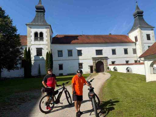 Auf verwinkelten Straßen erreichten wir den Stadtplatz. Es war still in der Stadt, kaum Verkehr, während sich hinterm Hügel die Parkplätze des Tierparks mit unzähligen Autos füllten. Wir aber steuerten auf das prächtige Schloss Salaberg zu, einem Privatbesitz, das bei größeren Gruppen besichtigt werden könnte. Ein Büffel am Rande des nahen Tierparks hob den Blick, als wir an ihm vorbei radelten, hinaus zum Wirt zKrottendorf, wo wir uns im herrlichen Gastgarten stärkten, köstlich und preiswert zugleich.