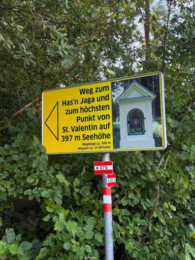 Der höchste Punkt von St. Valentin-397m- das Has’n Jaga Marterl, ist unser nächstes Ziel. Unterhalb erhob sich die Stadt, von Sonnenstrahlen verwöhnt, während wir uns durch hohes Gras kämpften, durch feuchten Boden, bis zur kleinen Lichtung. Wanderer begegneten uns dort oben, und die Lichtung ließ den Zeilen des Gedichtes von Angrüner Sinn ergeben