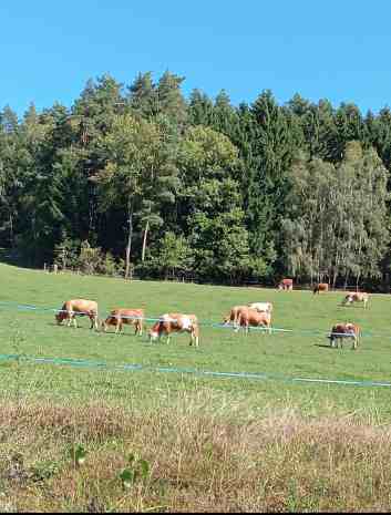 Pferdeaugen beobachten uns neugierig, während wir die herrliche Aussicht genießen. Schemenhaft ragen die Alpen am Horizont hervor. Nun erreichen wir Gutau, es ist dort recht ruhig, nur ein paar Radfahrer queren unsere Strecke. Für uns geht's hinaus nach Lehen, dort weckt ein Holzhaus das Interesse unserer Fotografin, bevor es zwischen kleinen Hainen mit großen Granitsteinen und Laubbäumen weitergeht. Einige Bäume streifen langsam ihr Sommerkleid ab und die bunten Blätter lassen unsere Räder lautlos darüber gleiten. Am Anstieg hinauf nach Erdmannsdorf radeln wir vorbei an Weiden, auf denen dutzende Rinder gemütlich grasen. Einige liegen im Gras, andere fressen gemächlich, wieder andere verfolgen uns mit neugierigem Blick. Aber jetzt geht es endlich hinunter zum Wirt in der Fürling. Hier kehren wir ein und speisen hervorragend. Am gegenüberliegenden Berg ist St.Leonhard bereits zu sehen, ganz oben lehnen sich die Häuser in den Hang.